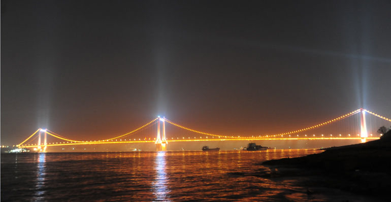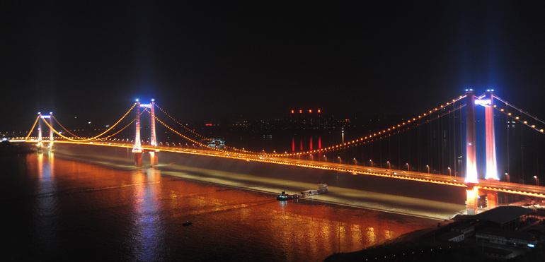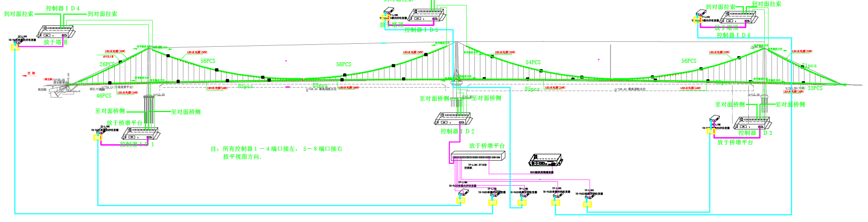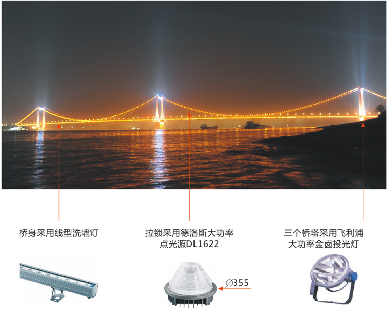 5、對(duì)大橋的梁體、纜索采用點(diǎn)光源照明與線型照明相結(jié)合的形式,對(duì)有設(shè)計(jì)特色的構(gòu)筑物采用重點(diǎn)照明的形式。