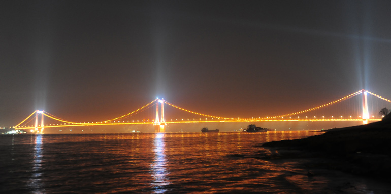 考慮遠(yuǎn)視覺效果,使用了目前市面上最大的點(diǎn)光源,燈具直徑達(dá)到355MM,確保燈具優(yōu)良散熱及遠(yuǎn)距離都能看到作為地標(biāo)的橋梁夜景效果,同時(shí)配合粗大的橋梁拉鎖使得燈具與建筑完美的融合。燈具專業(yè)的菱晶罩配光,確保各個(gè)角度看到燈具的亮度一致,且對(duì)行駛車輛沒有眩光。