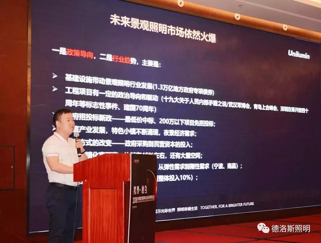 論壇報(bào)告時(shí)間正式開(kāi)始,首先由深圳市洲明科技股份有限公司景觀照明事業(yè)群總經(jīng)理劉俊先生為大家?guī)?lái)了主題為【文創(chuàng)燈光,城市照明的藍(lán)海與機(jī)遇】的精彩分享。他認(rèn)為未來(lái)景觀照明市場(chǎng)依然火爆,從政策導(dǎo)向和行業(yè)趨勢(shì)兩個(gè)方面,并結(jié)合政府資本投入和國(guó)民經(jīng)濟(jì)環(huán)境進(jìn)行了詳盡地分析,從而得出結(jié)論。