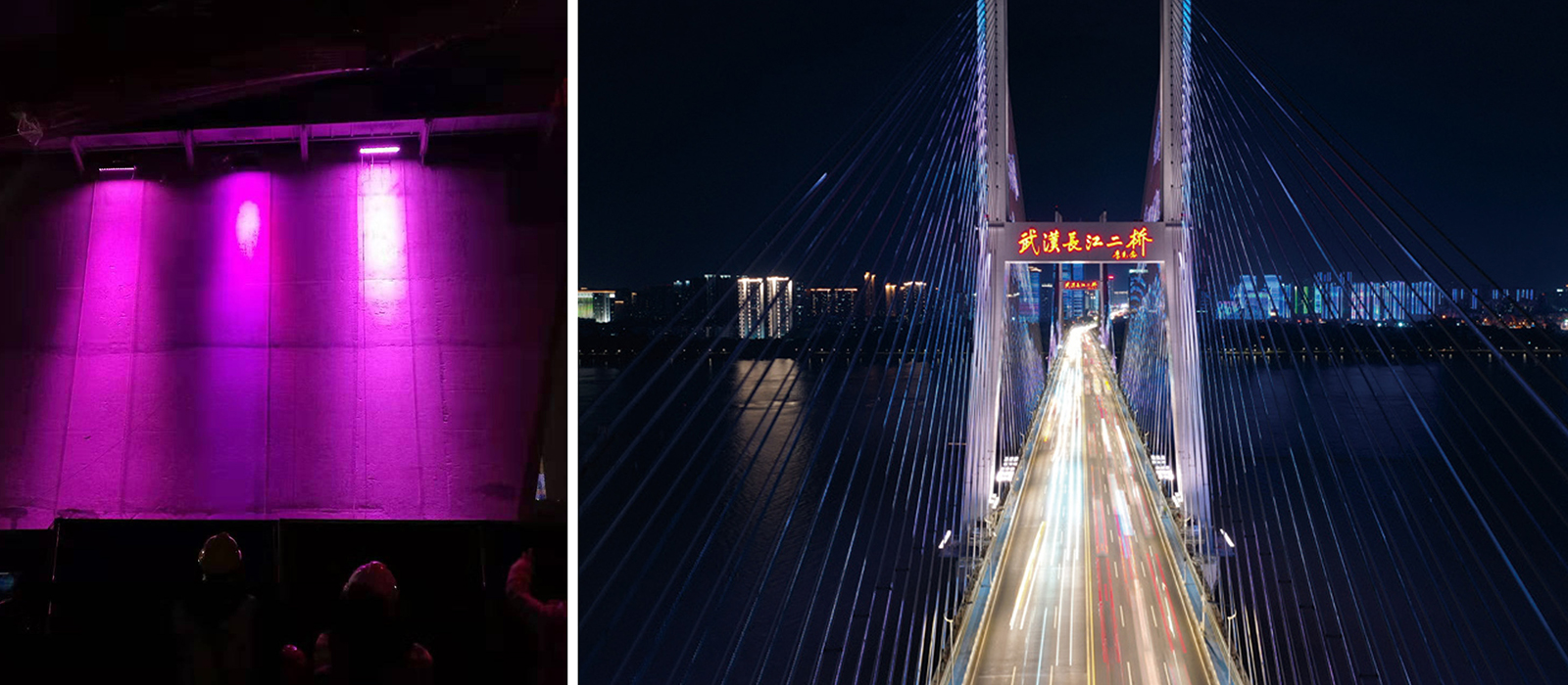 理念規(guī)劃的明晰,讓前期工作得以順利的展開,但付諸實(shí)際的時(shí)候,往往有難以預(yù)料到的困難。李猛提到橋梁亮化的難點(diǎn)主要在可視面的距離、燈具安裝可行性以及后期運(yùn)維方便等幾個(gè)方面;而橋梁LED點(diǎn)光源施工最為復(fù)雜困難,由于橋索無時(shí)無刻的產(chǎn)生共振,經(jīng)檢測(cè)振幅達(dá)到±20cm,其中為了配合兩江四岸建筑燈光秀表演要在長江二橋橋索處安裝大約20萬顆點(diǎn)光源,是難度非常大的工程。他表示要在橋索處安裝點(diǎn)光源就一定要考慮橋梁風(fēng)振等因素,為實(shí)現(xiàn)這一工程,他們將常用點(diǎn)光源燈槽結(jié)構(gòu)形式進(jìn)行了顛覆性調(diào)整,方形燈槽改為更加貼合、風(fēng)阻更小的弧形燈槽,但燈槽重新開發(fā)難度很大,需要各個(gè)專業(yè)的技術(shù)融合,數(shù)據(jù)論證擬真試驗(yàn)。最后歷經(jīng)3個(gè)月的時(shí)間將最終模型進(jìn)行風(fēng)洞試驗(yàn),才呈現(xiàn)出滿意的效果。